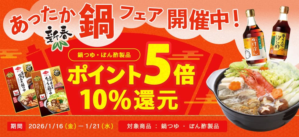 チョーコー自慢のだし旨シリーズ&お鍋に欠かせないポン酢製品、 いつもの5倍、ポイントプレゼント中! この冬大活躍間違いなし!美味しい鍋つゆ&ポン酢はにいかがでしょう。 ぜひお得なチャンスをご利用くださいませ。 おまとめ買いもどうぞこの機会に! <対象商品はこちらから>